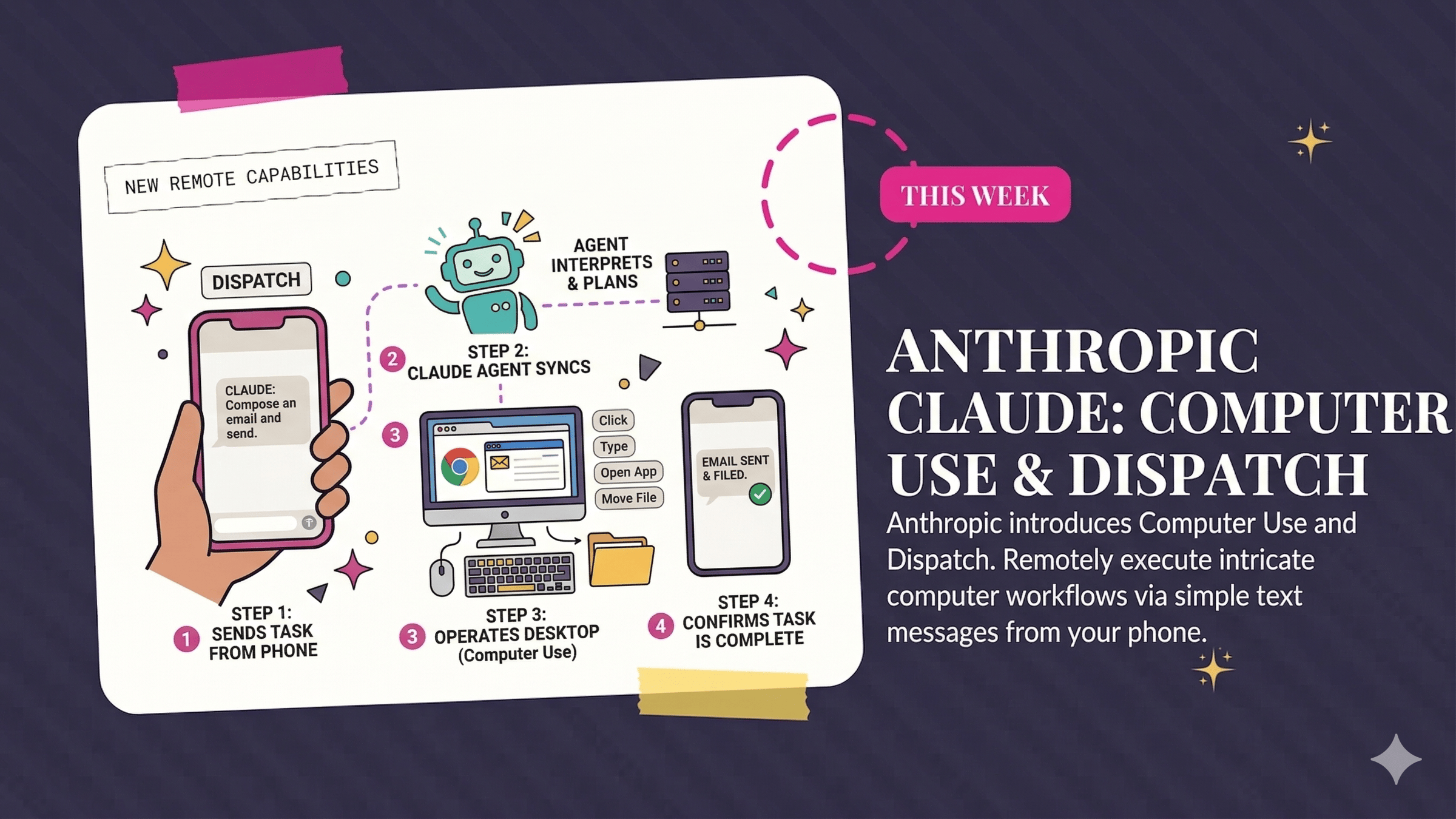 Anthropic released two things that work together: Computer Use and Dispatch. Computer Use lets Claude take control of your screen. It can click, type, open apps, navigate Chrome, fill out forms, and move files. When Claude has a built-in connector for a service (like Slack or Google Calendar), it uses that first. When it doesn't, it literally operates your computer to get the job done.