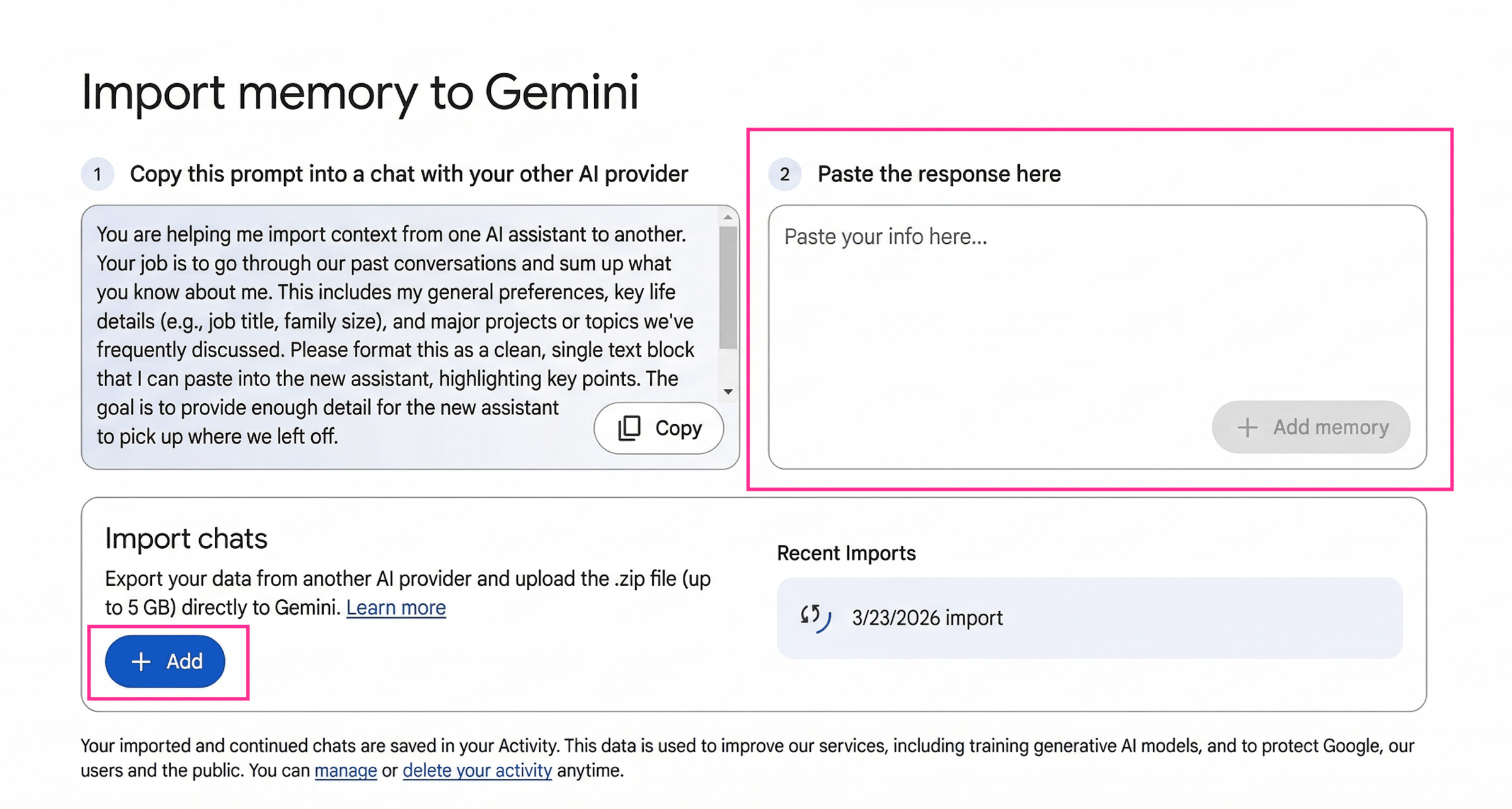 Part 1: Memory Transfer Gemini gives you a prompt to paste into your current chatbot. That chatbot generates a summary of everything it knows about you. You copy that back into Gemini… and now it already understands your preferences, tone, and background.
