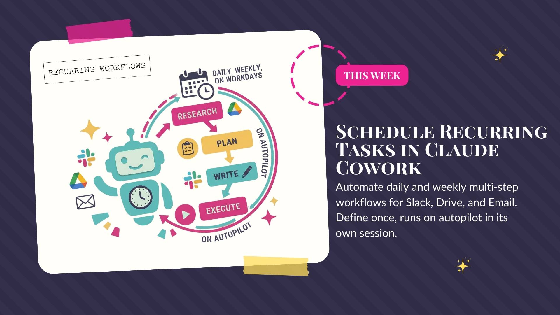 Here's what that actually looks like: You tell it once — "Summarize my Slack messages every morning" or "Pull a weekly report from Google Drive every Monday" and it just... does it. No re-prompting. No remembering to ask.