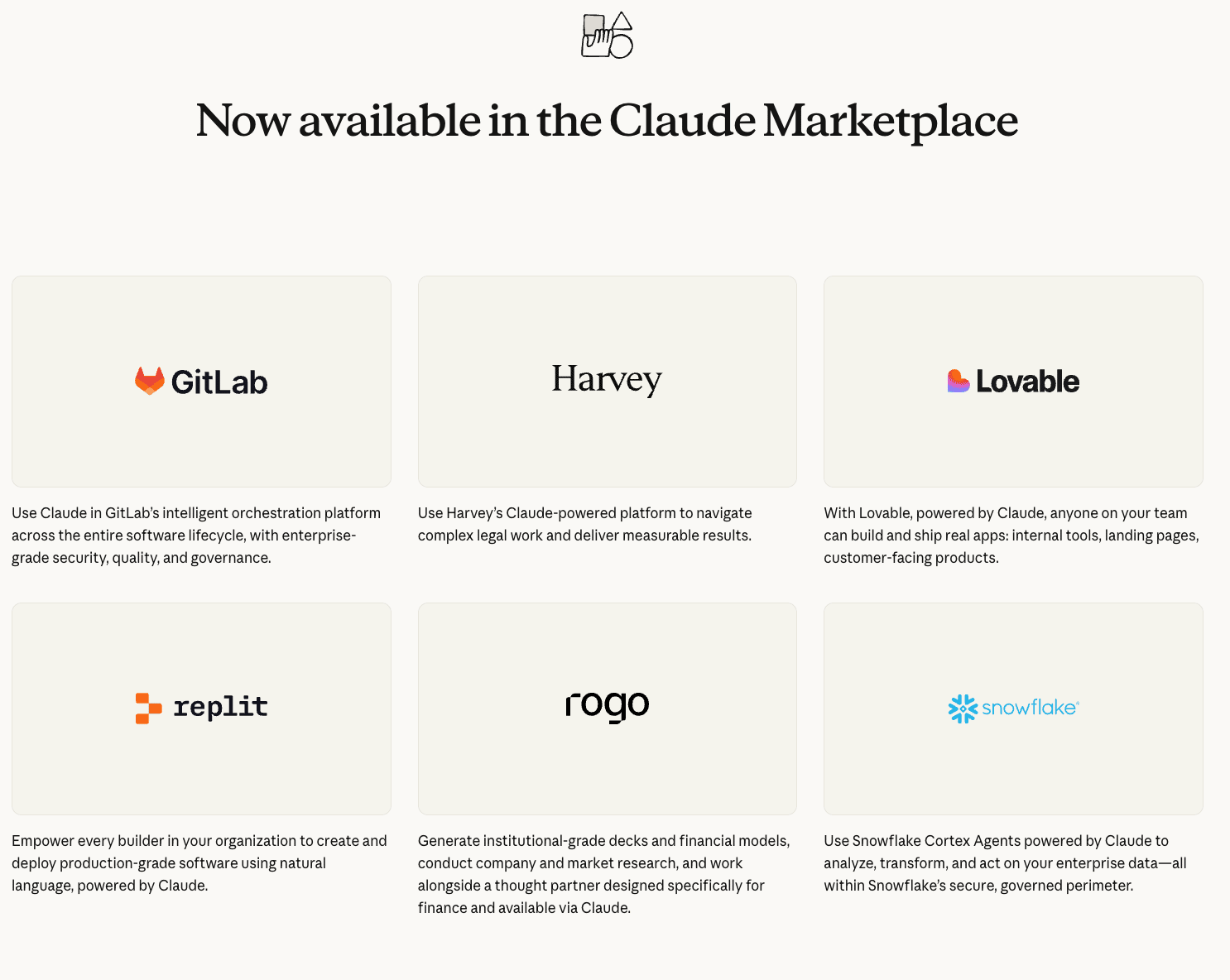 The launch lineup includes Snowflake (data), GitLab (software development), Harvey (legal), Replit and Lovable (app building), and Rogo (finance). Enterprises with existing Anthropic spending commitments can redirect part of that budget toward these partner tools. Anthropic isn't taking a commission on purchases.